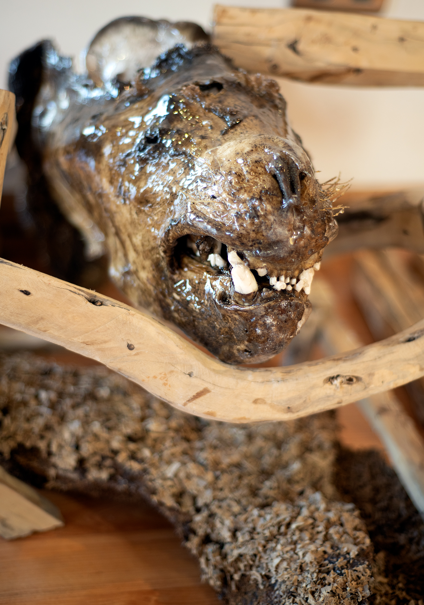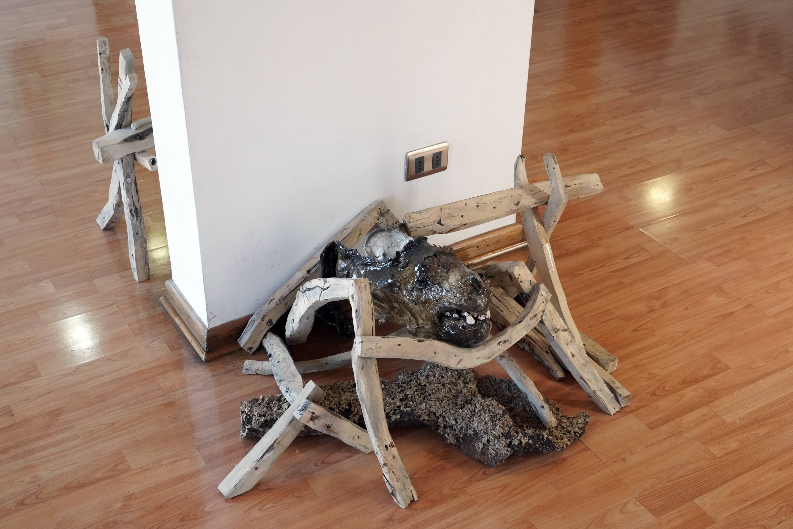 Lobo, Cabeza de lobo marino cubierta con resina y muebles de chañar, Medidas variables.