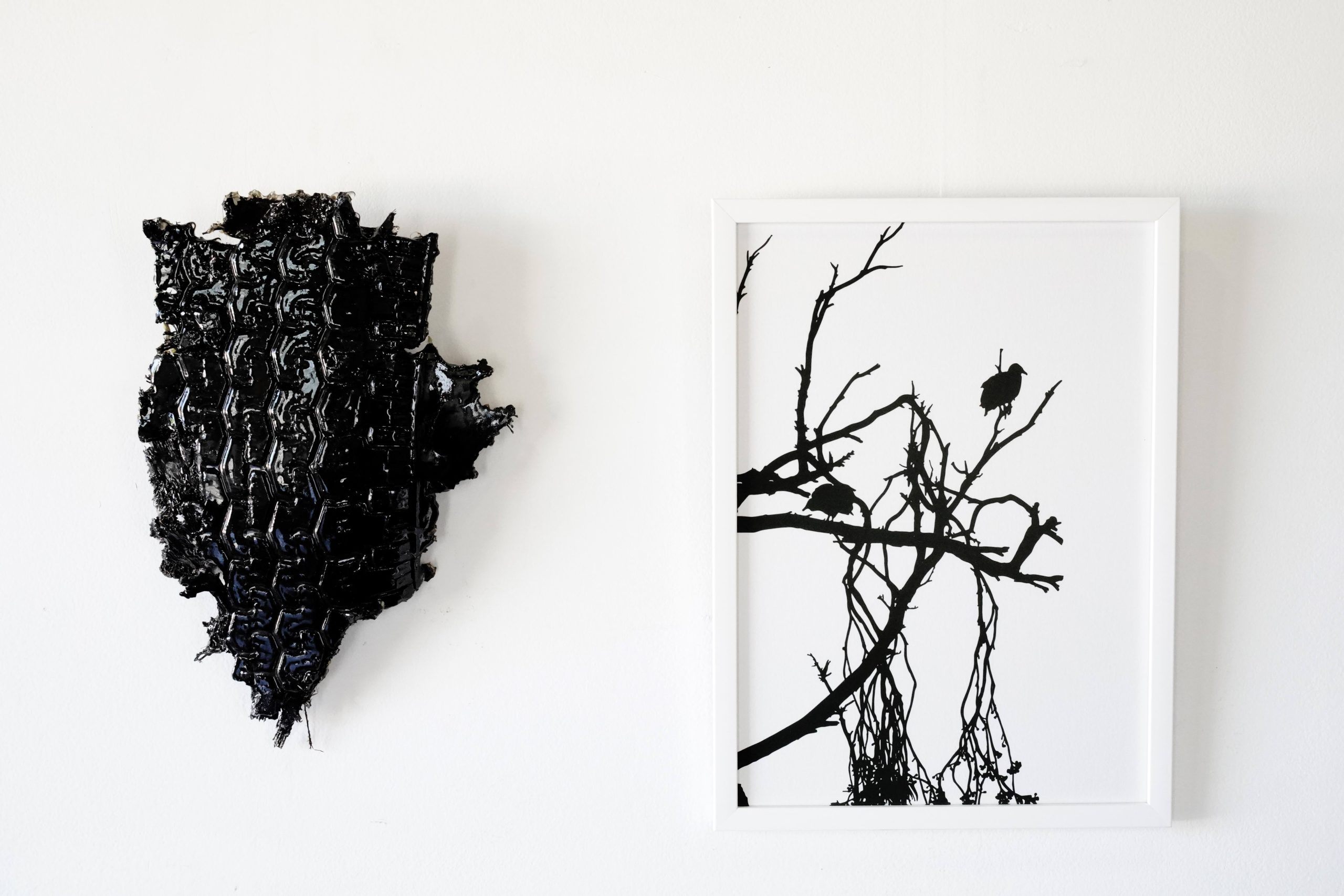 Serie negra un poco verde, Veinte impresiones FineArt, 38,5 cm x 27,5. – Lenguas de Vaca, Objetos encontrados cubiertos de resina, Medidas variables.