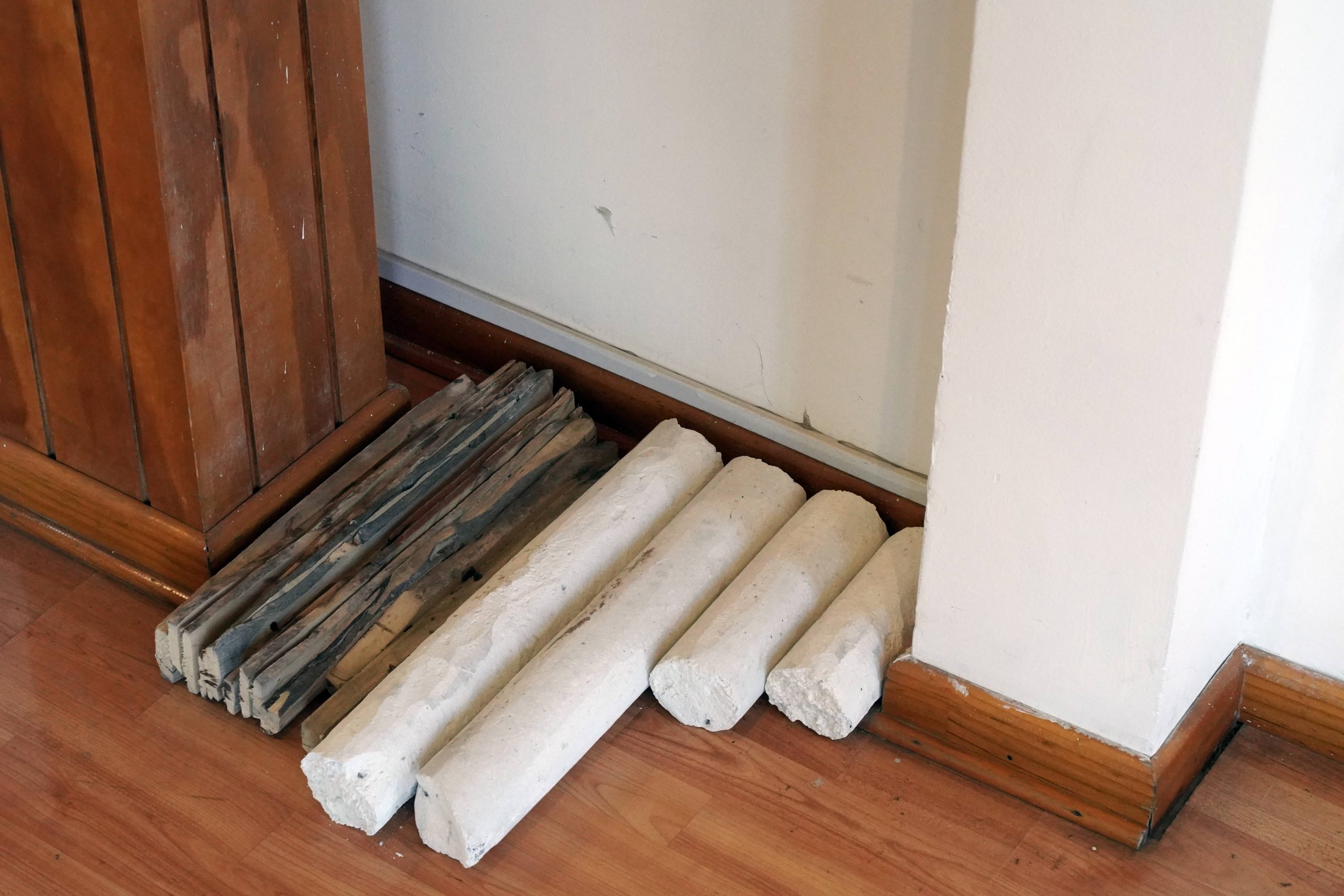 Zampoña, Bloques de carbonato de calcio y láminas de chañar, 50 x 50 x 8 cm.